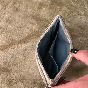 Coach clutch easily fits an iPhone with card case, lipstick, and a key