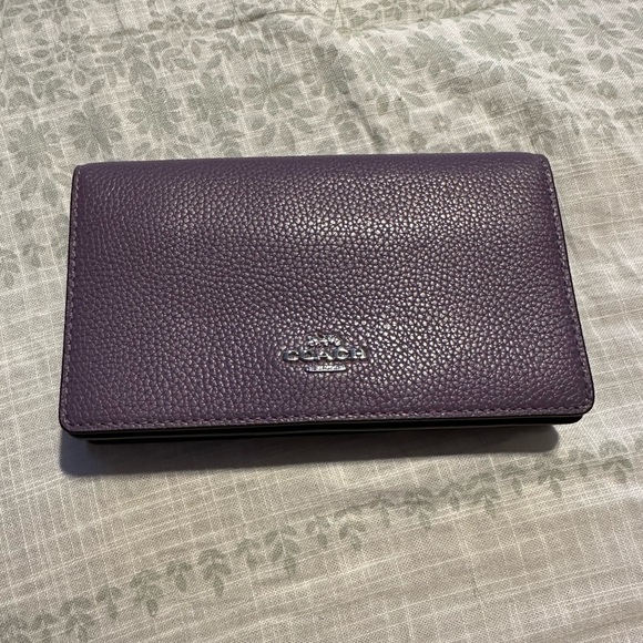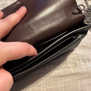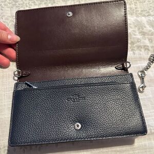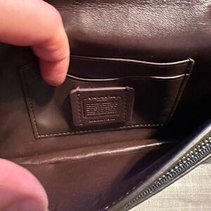 Coach clutch with metal shoulder/crossbody strap can also slide onto a thin belt. Used one for a work holiday party.