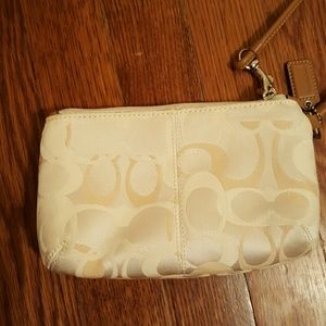 Small cream and beige Authentic Coach wristlet or clutch. Never used. I always carry bigger purses so I never used this. No stains or signs of wear. The color is very pretty and goes with anything! Front pocket and zipper in back.