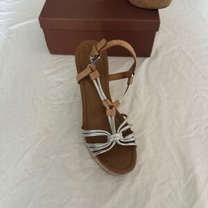 Beautiful silver and nude leather Coach 4.5" platform wedges. Worn a handful of times, very good condition.