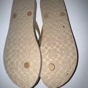 Elegant cream Coach flip-flops. Designed for the fashion-forward woman, these thongs feature a chic chevron pattern that adds a touch of sophistication to your casual beach or poolside ensemble. The slip-on design ensures ease of wear, perfect for those quick outings or relaxed days by the water. Crafted with a durable rubber upper and lining, these sandals are made for comfort and longevity. The flat heel offers a stable stride, while the standard shoe width accommodates a size 7 fit. Whether you're strolling the boardwalk or enjoying a seaside brunch, these sandals are a versatile addition to your warm-weather wardrobe.