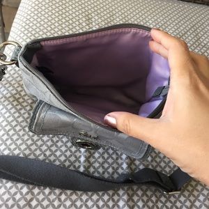 Excellent condition grey cross body bag. About 8.5" x 7" x .75". Beautiful and CLEAN lavender lining inside , cute front pocket for chapsticks or keys
