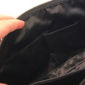 Top zipper closer opens up to a zip pocket and 2 open pockets