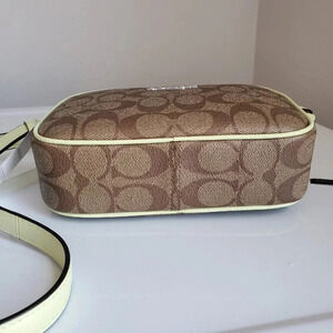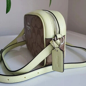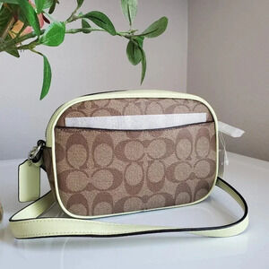color : Pale lime/Khaki Style Number CQ874 Measurements Length: 8.0" Height: 5.75" Width: 2.5" Materials Signature coated canvas and smooth leather Fabric lining Strap Detachable strap with 22.5" drop for shoulder or crossbody wear Features Outside open pocket Zip closure Inside multifunction pocket Two credit card slots;#Valentine#Trending#Crossbody#Spring#Summer#Unique