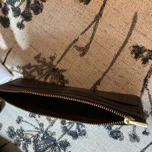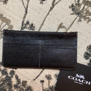 All black crossbody or long shoulder COACH purse with interior separate wallet and/or card carrier, and beautiful gold accent. Total Strap length is 40” long so hang length is 20” but is adjustable to alter 7” up or down. Purse is 8.5” wide, 5” high and 1 1/4” deep. Cute and practical purse has two separate compartments on inside and open slot in back for quick access to close to body items. Phone and lipstick fits with plenty of room to spare. Original coach purchase bag included as well as cloth storage sack. Bought new in July, paid 225.00, lightly used twice, lots of life left in it due to COACH awesome quality.