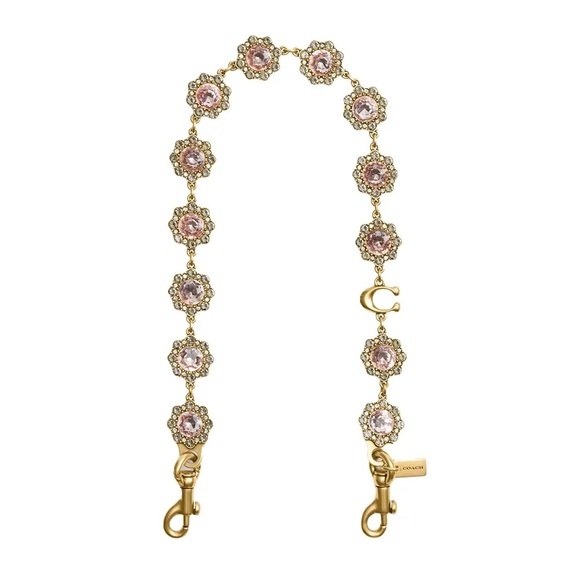 Chic Coach bracelet with gold links and pink floral accents. Adds elegance to any look.