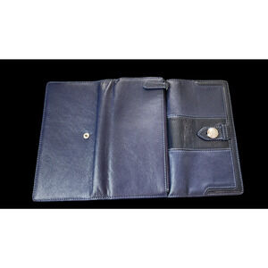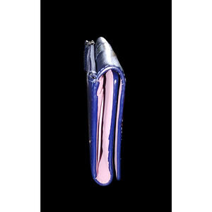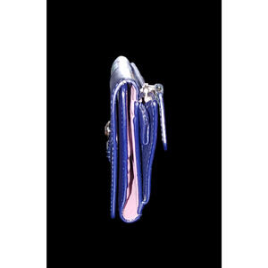 Material is dark blue leather with dark patent leather trim and nickel hardware.
