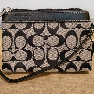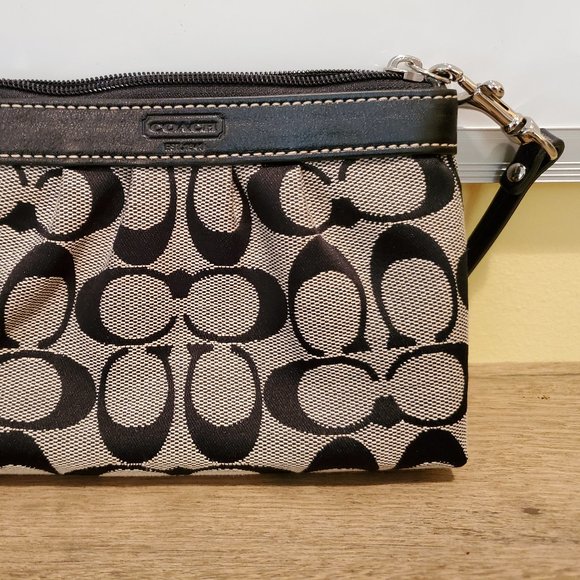 Small zippered clutch with dark brown leather trim and signature C canvas fabric. Brand new condition. Roughly 6.75" by 4.75". Small interior side pocket. Stitched top pleats on one side.