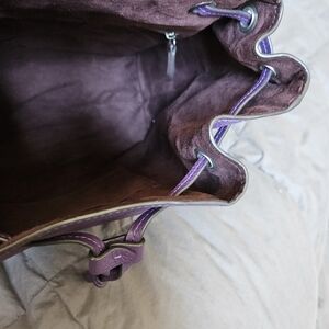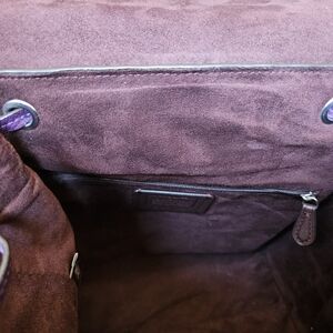 Used purple drawstring back from Coach. Soft pebble leather features chrome hardwear, wine-colored suede interior, inside and outside zipped pockets. The bag is midsized with dimensions 13×11×6 and adjustable strap length of 24-30 inches. Used for one season, there is some wear on the corners as shown in the pictures. (Non-smoking environment)