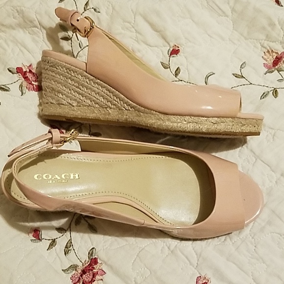 Light pinkish/peach shiny patent leather with coach ankle jewel. Low 2 in. Heal only worn once very good condition