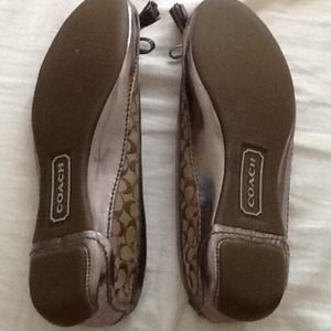 Tan and silver Coach flats with tassel. They have been worn so there is some discoloration on the right shoes outside silver rim.
