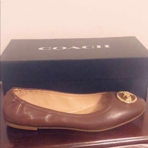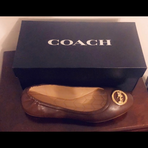 Cute brown Coach flats with gold Coach emblem!