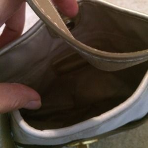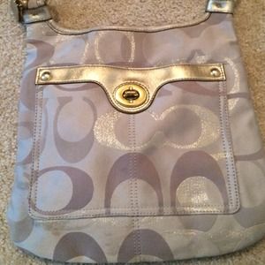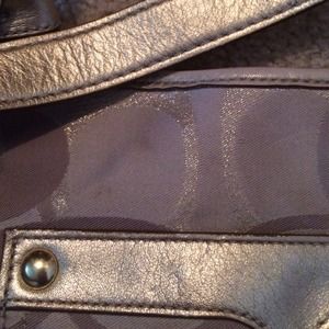Very pretty purse. Cs have gold sparkles in them and the strap is good. Inside and outside are clean, just a couple little spots (see photo) that aren't noticeable and could probably be cleaned. Includes Coach dust bag.