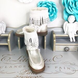 Coach gold metallic leather fringed boots with pearl detailing on the fringe, and lined with sheep fur, new without box.