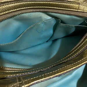 Coach gold metallic leather satchel handbag with gold tone hardware 3 compartment zip closure at center 4 pockets at interior wall 1 zip closure fabric lining hangtag at side logo at front lining have stains exterior marks creasing hight 9” width 11.5” depth 4” strap drop 10” strap have some cracks The dimensions are based on approximately measurements before placing an order please check take a moment to view all photos using feature for a closer look