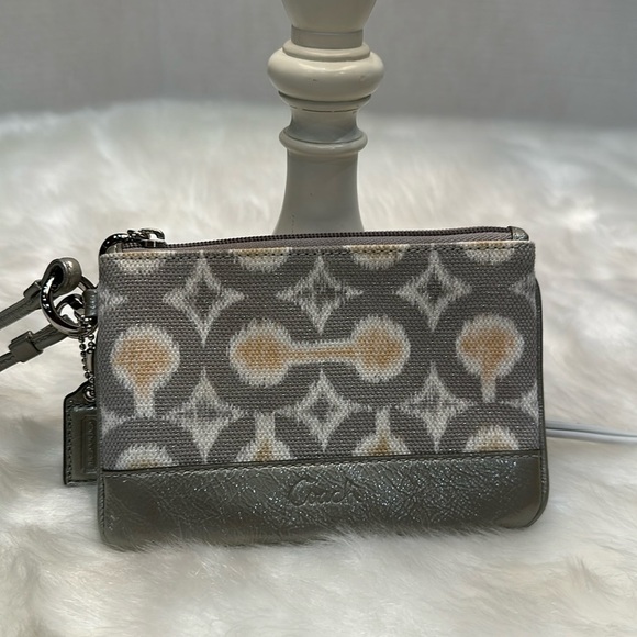 Coach wristlet with one side detachable strap, silver keychain, approximate dimensions: