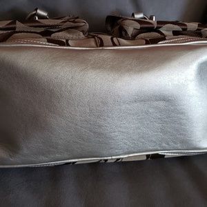 Excellent condition coach hand bag with large signature pattern. This one was my baby minimal use maybe 2x. No wear inside or out. Leayher a metallic color simpley beautiful comes with dustbag. Could look like a mini duffle handbag but can be put on your shoulder as well