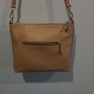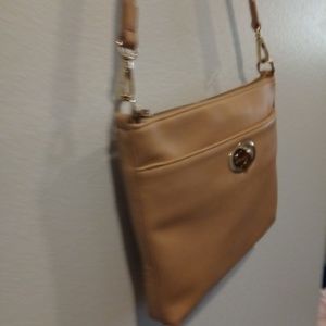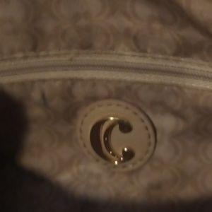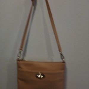 Coach hand bag tan textured leather with adjustable strap, pocket on front and back and 1 zipper pocket inside with 2 smaller pockets inside. in very good condition with only minor ink pen marks on interior, no marks on outside