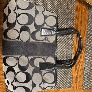 This is a Coach Signature C tote bag. The bag features the iconic "C" design in a black and grey canvas with black leather trim and handles. It has a zip-top closure and is designed to be spacious for everyday use.