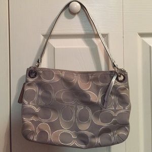 A very pretty dark and light grey Coach handbag for sale! It has a pink lining inside and many pockets inside. This bag has been lightly used and still in great condition. This is a great bag for the upcoming fall!