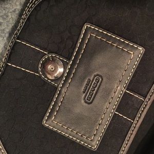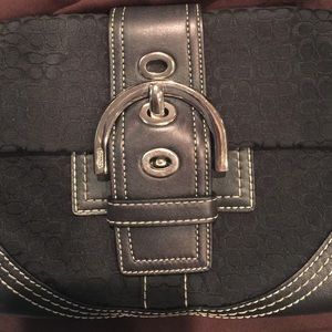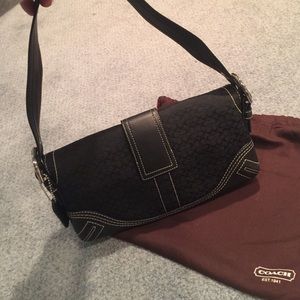 Coach small sized shoulder bag. Authentic. Black with white detailed lining inside. Embroidered signature coach "C"'s creating design. Silver hardware. Includes original dust bag shown. In great condition- barely used. I ship next day!