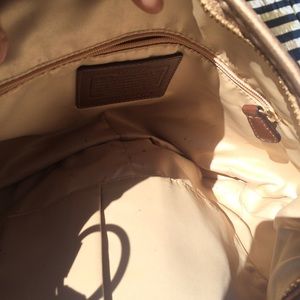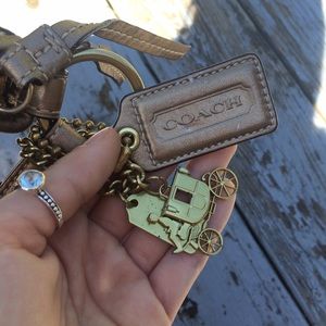 Gold coach hand bag with charms, large buckle strap and inner pouches. Some small spots on outside of bag , and Pen parks inside as pictures. This bag has been used but is still in great condition