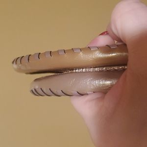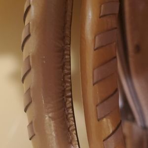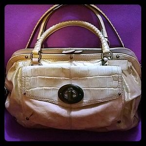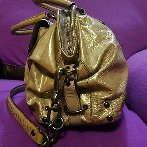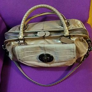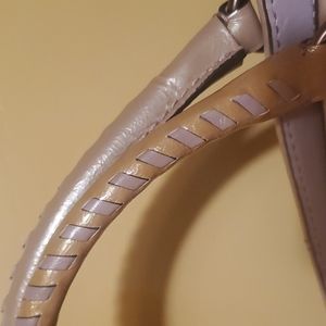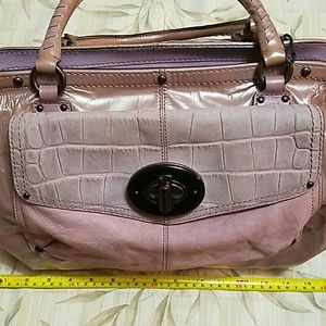 Satchel handbag with long removeable strap, bag has two zipper heads to close bag see pic #4. Color is a light lavender. There is a front pocket with big buckle for closure. Lining inside is brown with zipper pocket and two small pockets . See pic #3 bag has adjustable straps. Material is patent leather with a suede material on the front pocket. the handles are a little discolored. two tone color.