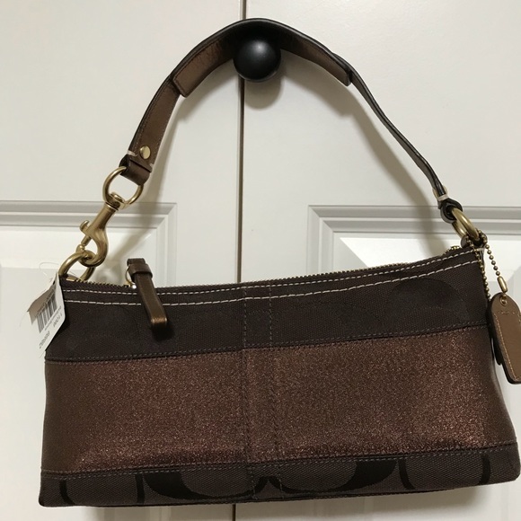 Leather handle, dark brown with gold signature Coach canvas. It’s a shoulder bag and brand new.