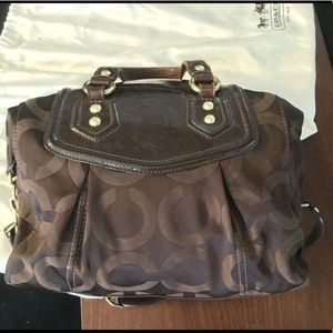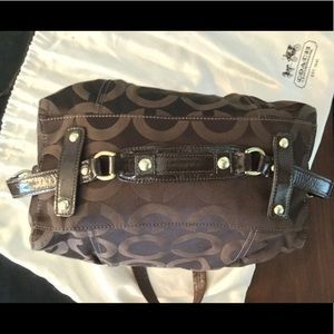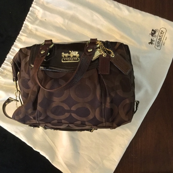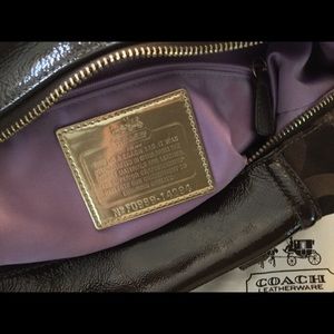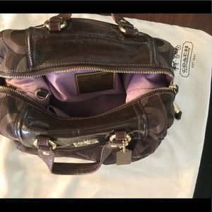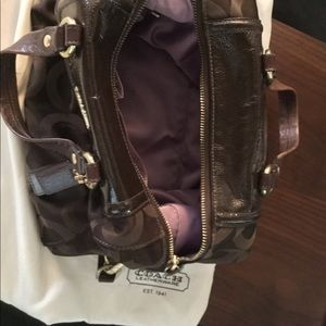 Brown classic C Coach bag with gold hardware. Bowling bag style with optional long strap that can be used or stored underneath the bag. Purple inside with gold authentication emblem. Comes with duster bag. Almost no wear on bottom or straps.