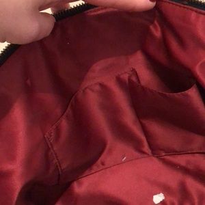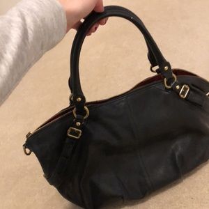 Black leather handbag with shoulder strap attachment included. 2 cellphone pockets inside + 1 zipper pocket. Good condition.