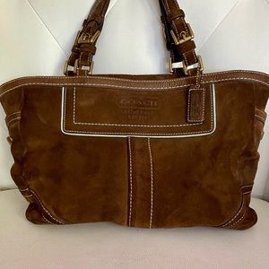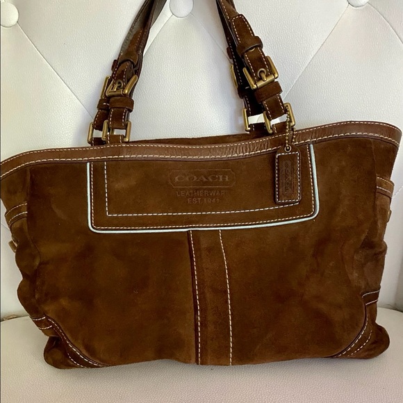 Adorable Coach brown suede handbag with light blue stitching and details ๐ฆ Matte gold strap buckles. Very gently used TWICE, extremely minimal signs of wear. No stains. Light blue interior.
