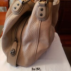 Coach Handbag, hobo/shoulder bag style. neutral light tan suede. Not from the outlet! This is the real deal. center zip compartment with side pockets. zip locks with dark gunmetal hardware. Suede has some darker spots. only used a handful of times. it is a heavy bag.