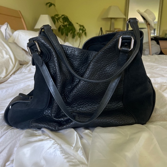 This is a black pebble leather and suede shoulder bag. Gunmetal hardware, center zipper compartment and open compartments on each side with a magnetic snap closure. Coach embossed hangtag on the strap and the satin storage bag is included. Minimal wear.