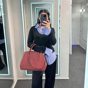 Burgundy "glovetanned" leather, tonal hardware and gold-tone hardware, rolled handles, single interior top zip pocket, knotted center closure, detachable adjustable shoulder strap, protective feet at base, single open interior pocket