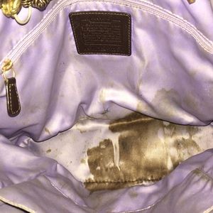 Used, good condition, authentic large Coach handbag. Kept in dust bag when not in use. Minor wear to exterior, staining on the interior. Could use a good cleaning.