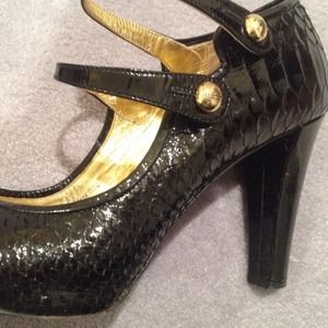 Black snake skin patent leather coach heels ! Great to wear with jeans or a dress. So comfortable and fashionable :)