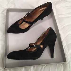 Black suede coach pumps with gold accents. Slightly worn but they're in great condition