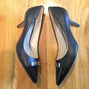 These beautiful authentic Coach heels are black and have a silver metal plate that says Coach New York on the front, the tip of the heel is shiny. They were only worn once or twice so are in excellent condition and retail for $120. They are size 7.5.