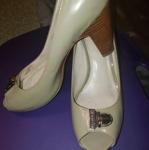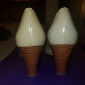 Coach, patent leather, beige cone heels, size 8. In good condition with little signs of wear. Very comfy. Secure fit.