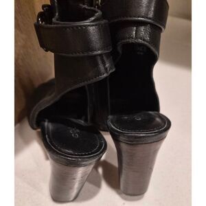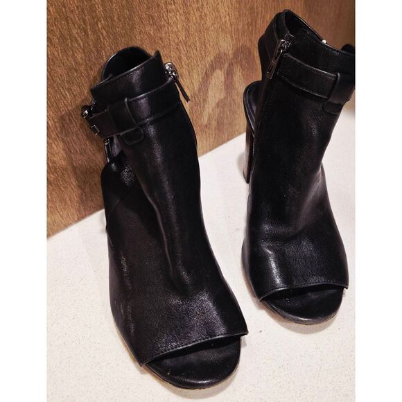 Coach Lafayette peep-toe ankle bootie. These stylish boots feature a black leather upper, an open toe, a stacked block heel around 4 inches high, and both zipper and buckle details for closure and accent.