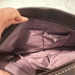 Coach Brown Pebble Leather Crossbody/Handbag F15064. dark brown pebbled leather, with a zipper pocket. The inside is lined with lavender colored fabric, and has two slip pockets, and one zipper pocket. The bag can be converted from a handbag to a crossbody. 1 exterior zip pocket