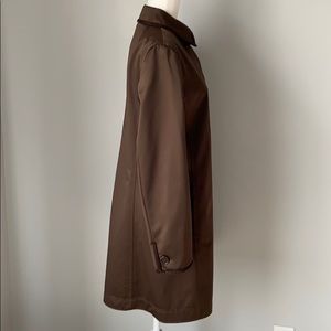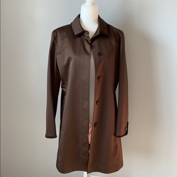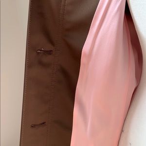 Brown Coach jacket with brown suede accents at neckline, sleeves and pockets. Pink silk lining.