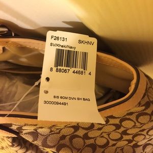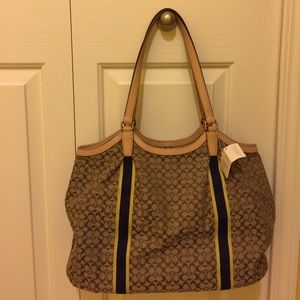 Coach khaki and navy/yellow striped shoulder bag.