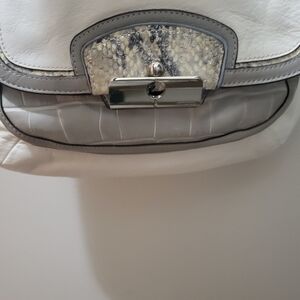 This Coach bag is very unique. she is lined with embossed snake. She has an outside pocket that is open by lifting the silver clasp. Her inside is a beautiful blue. she is in great used condition. I think she is from 2010. Call outs- she has been conditioned, but she could use a little more. she has a small mark and a thread on her handle. she had some marks by her zipper. she has a couple of front, back, and side marks. Her inside creed and coach tag are faded and difficult to make out. You will see in the first photos that you can't see her call outs. you have to look closely to find them. see all photos for call outs. price is based on call outs. she is still beautiful and unique with a lot of life left.