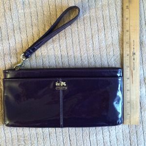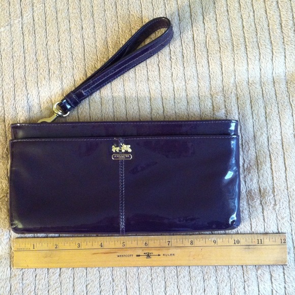Clutch was never used, but the tags were taken off although they are still inside the clutch. Measurements are on the picture. In perfect condition. Color is a deep purple with sparkle.