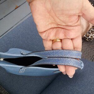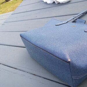 Cross grain leather| Inside zip, cell phone and multi function pockets| Zip-top closure, fabric lining| Handles with 10" drop| 11 3/4" (L) x 10 1/2" (H) x 5 1/2" (W)