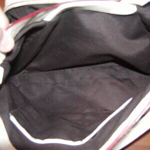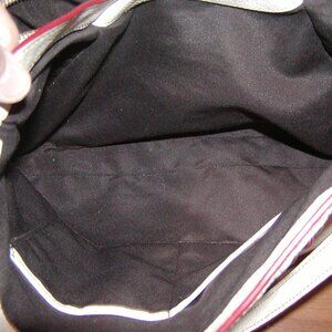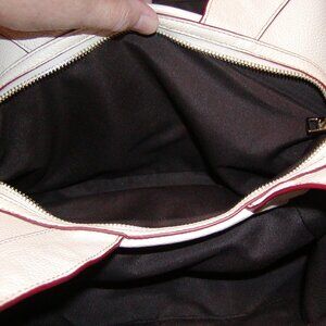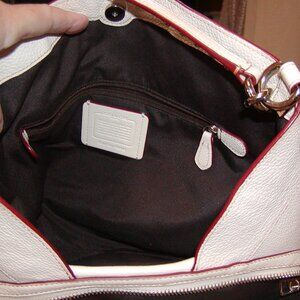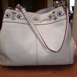 Large leather Coach handbag. Does have some brown stains on the purse on the backside. Except for stains purse is in very good condition. Has 3 large compartments with zippered pocket inside one compartment. Very nice purse for those who like larger handbags. Height is 12", length is 15", and the width is about 4". Has design on it with silver and red beads.