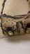 Stylish Coach shoulder bag in tan and black. Features gold hardware and dual front pockets. Perfect for everyday use.