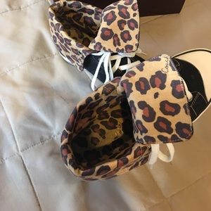 Worn twice. Leopard inside. Fold down tops. Black on outside.