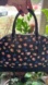 dual handles but no crossbody strap exterior has a printed floral pattern with orange, white, and blue roses on a black background, while the interior includes a zippered pocket and a multifunction pocket.